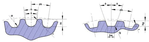 | Groove | Pitch pb | alveolar depth hg | Cogging arc radius R | Addendum circle half angle r1 | Alveolar width s | Double pitch distance 2δ | Tooth angle |